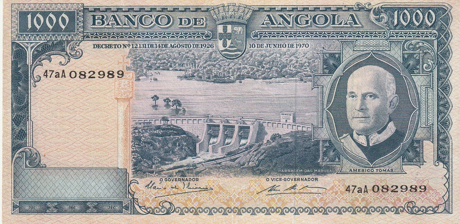 Angola ANG-P-98, 1.000 Escudos, Nº.-47aA082989, Américo Tomás, Look Scand, 10-6-1970, XF+