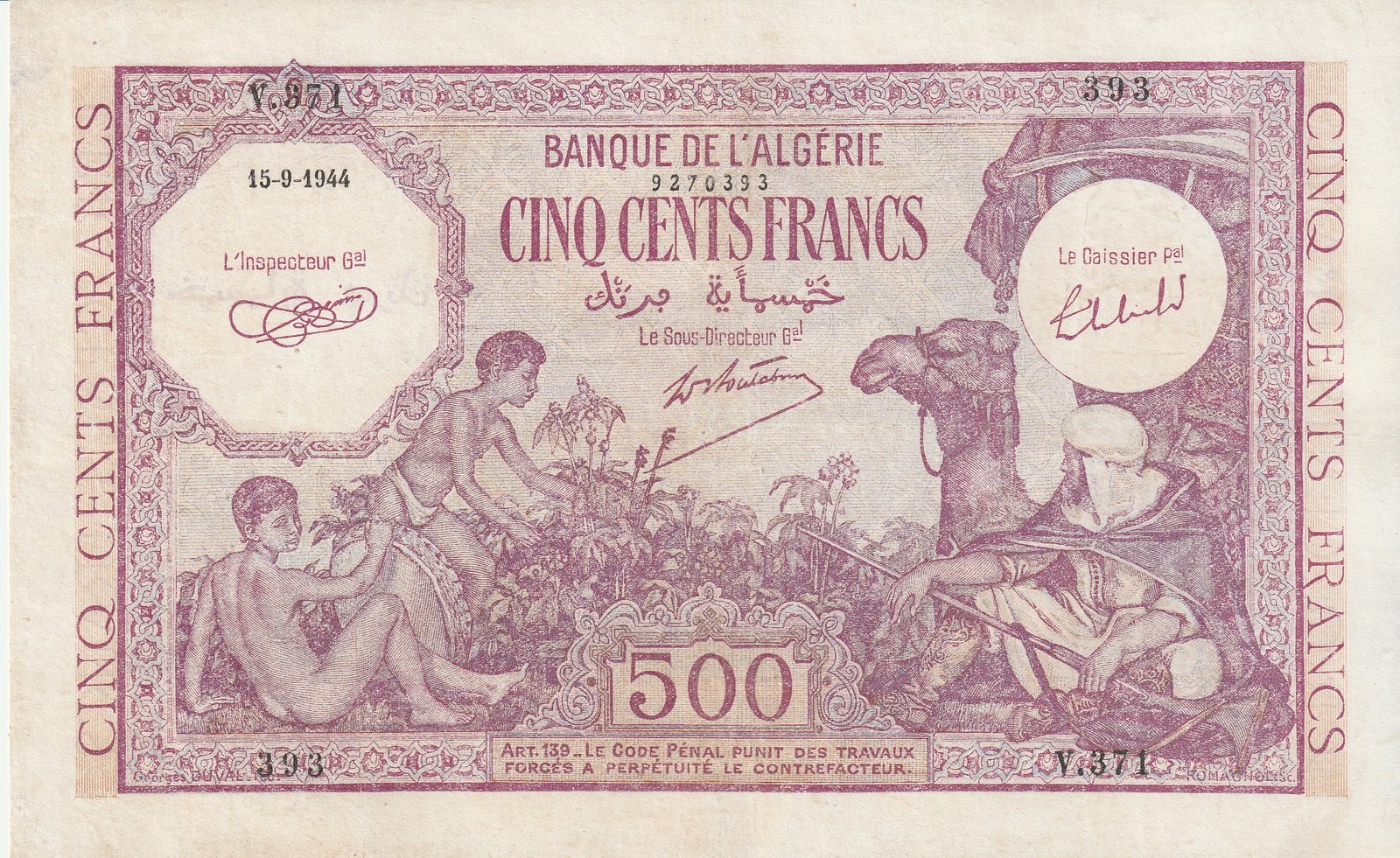 Argelia ALG-P-95, 500 Fcos, Nº 9270393, 15-Sept.-1944, Look Scand, XF