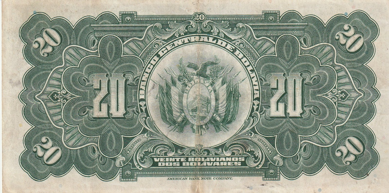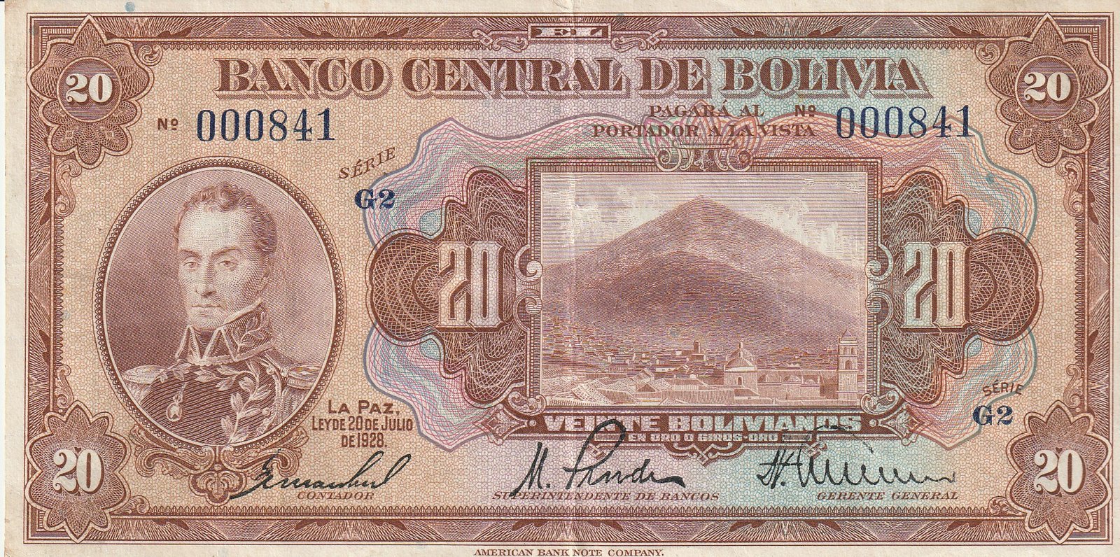 Bolivia BOL-P-122a(9), 20 Bolivianos, 1928, Nº 000841 (muy bajo), XF