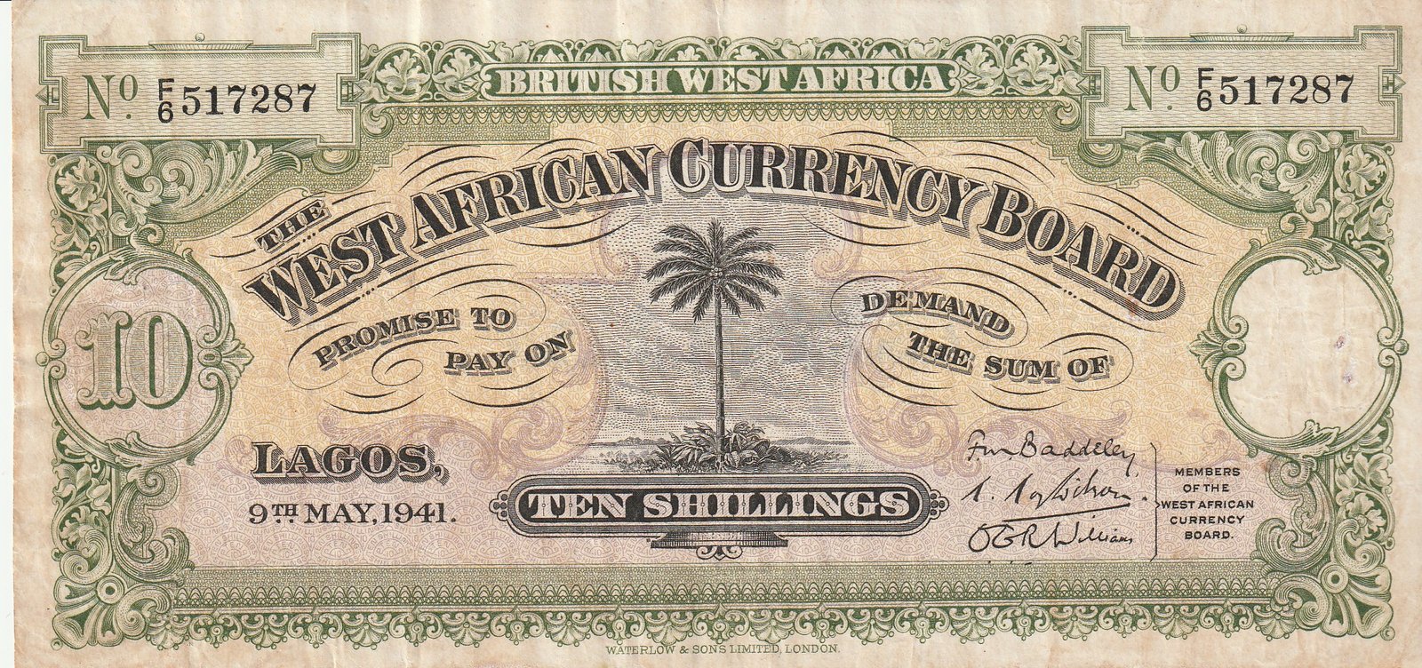 Britihs West Africa BWA-P-7b, 10 Schillings, Nº.- F/6-517287, 9-Mayo-1941, Look Scand, XF-