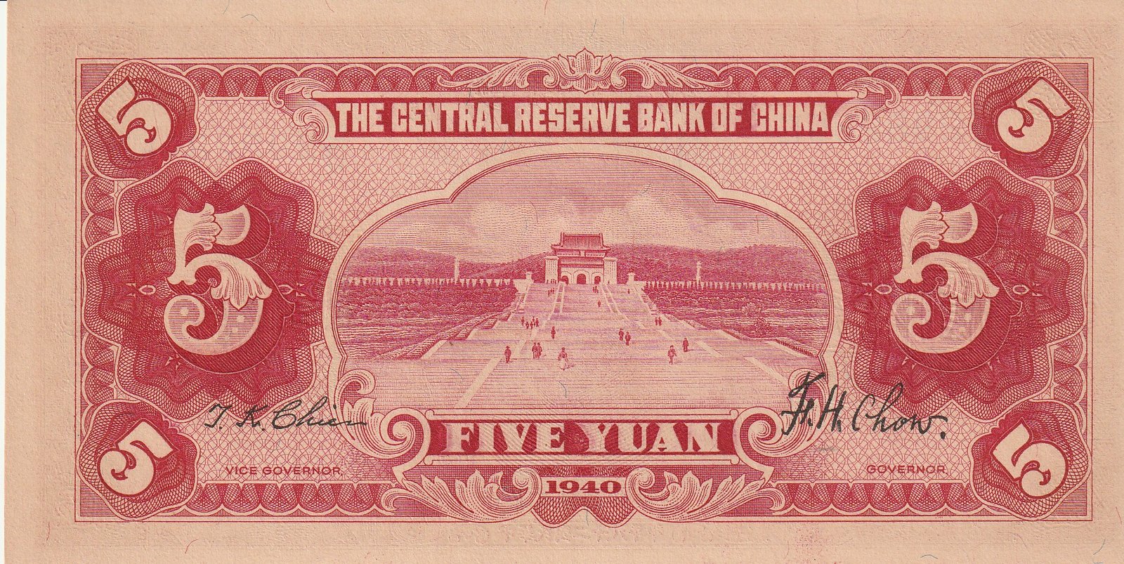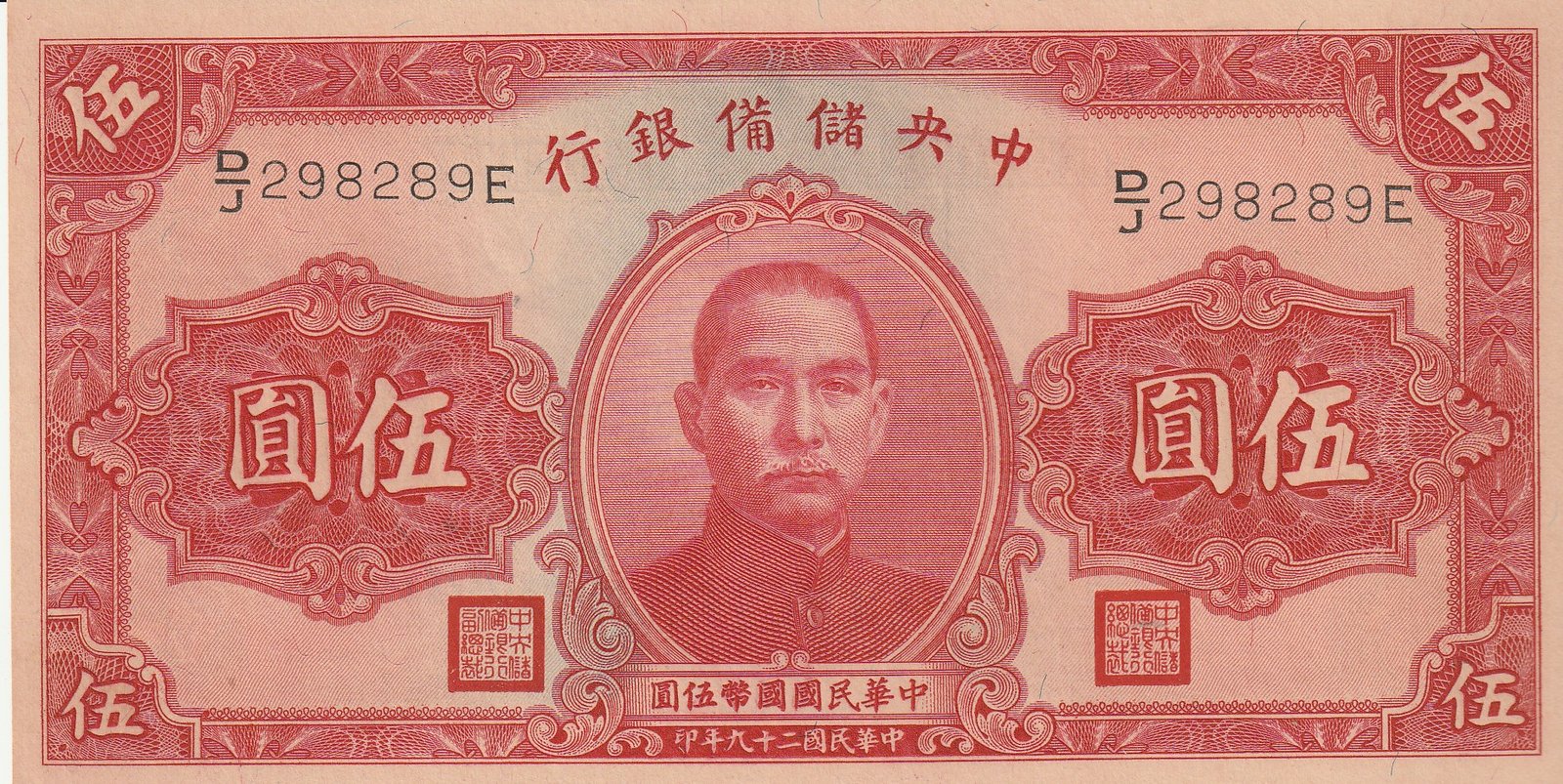 China CHI-P-J10a, 5 Yuan, 1940, Nº D/J-298289E, Look Scand, UNC