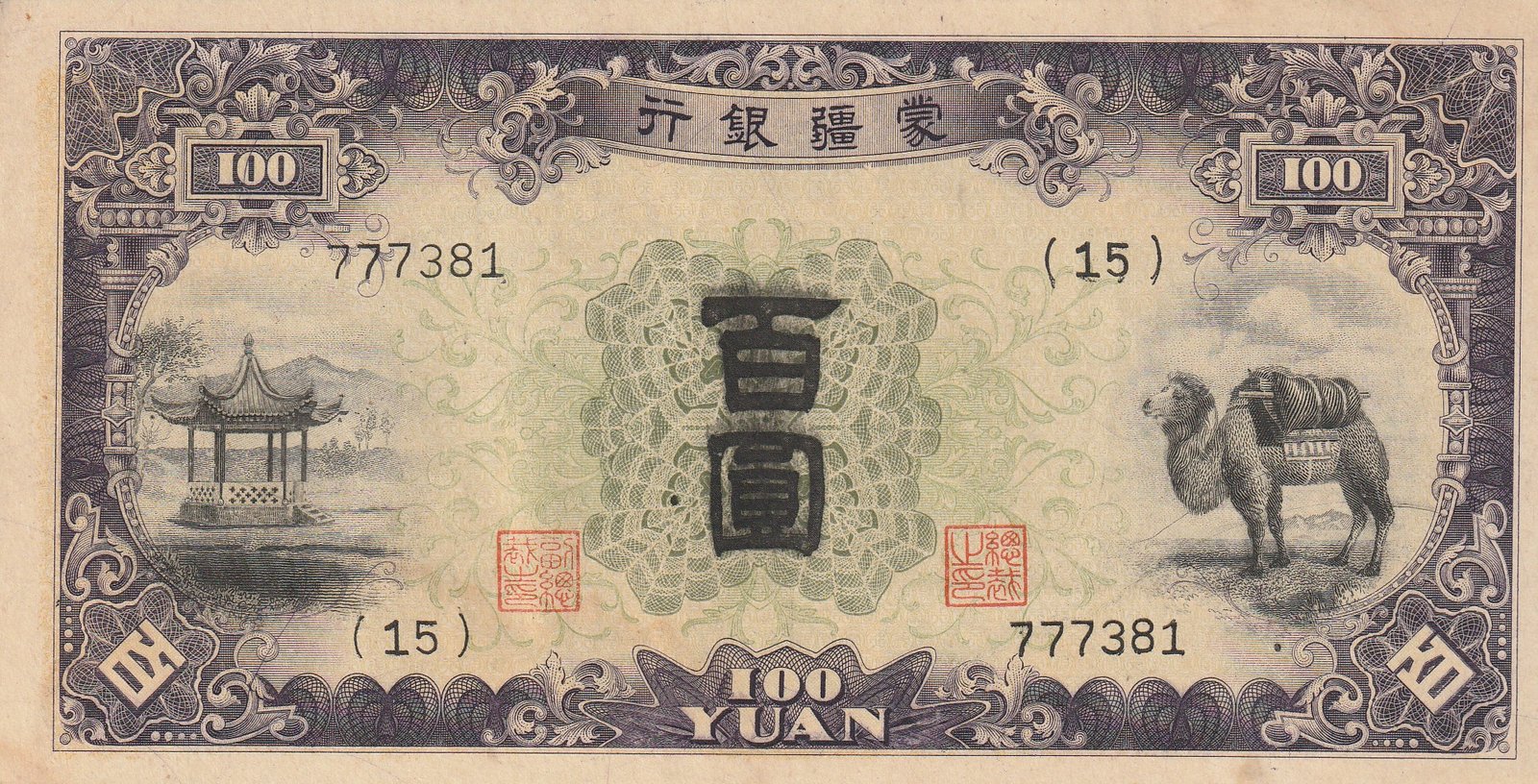 China CHI-P-J112, 100 Yuan, 1938, Nº 777381, Look Scand, XF
