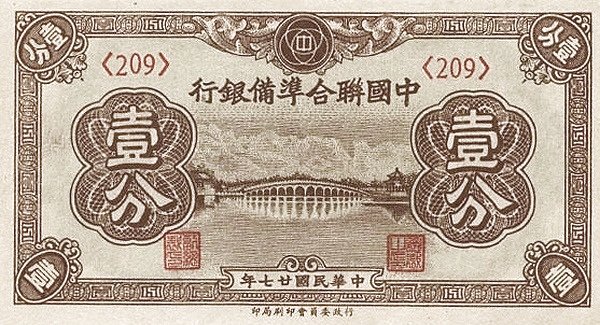 China CHI-P-J46, 1 Fen, 1938, aUNC