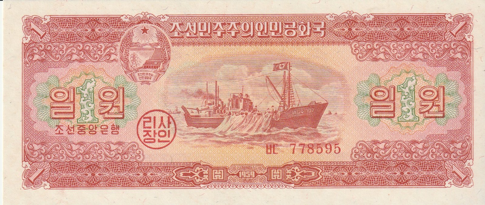 Corea del Norte NKR-P-13, 1 Ganado, 1959, Nº 778595, Look Scand, UNC