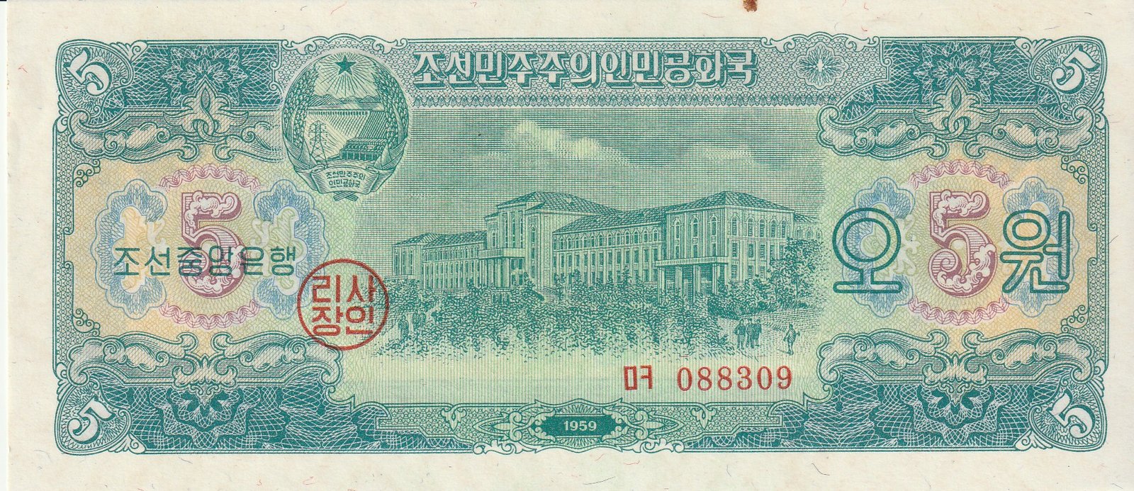 Corea del Norte NKR-P-14, 5 Won, ND-1959, Nº 088309, Look Scand, UNC