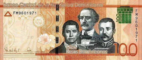 Dominicana Rep. DOM-P-190(24), 100 Pesos Oro, 2024, Duarte, Del Rosario, Mella, UNC