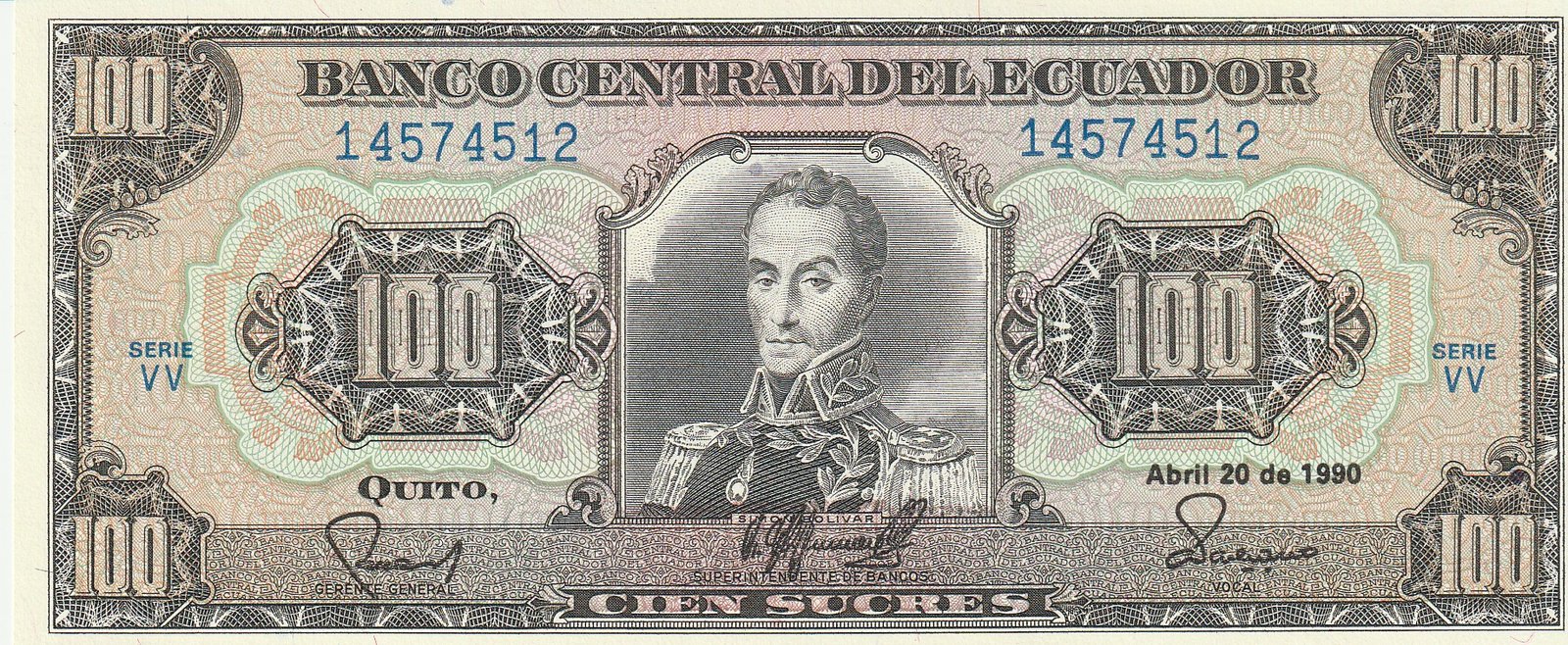 Ecuador ECU-P-123, Serie VV, 100 Sucres, Simón Bolivar, 20-4-1990, UNC