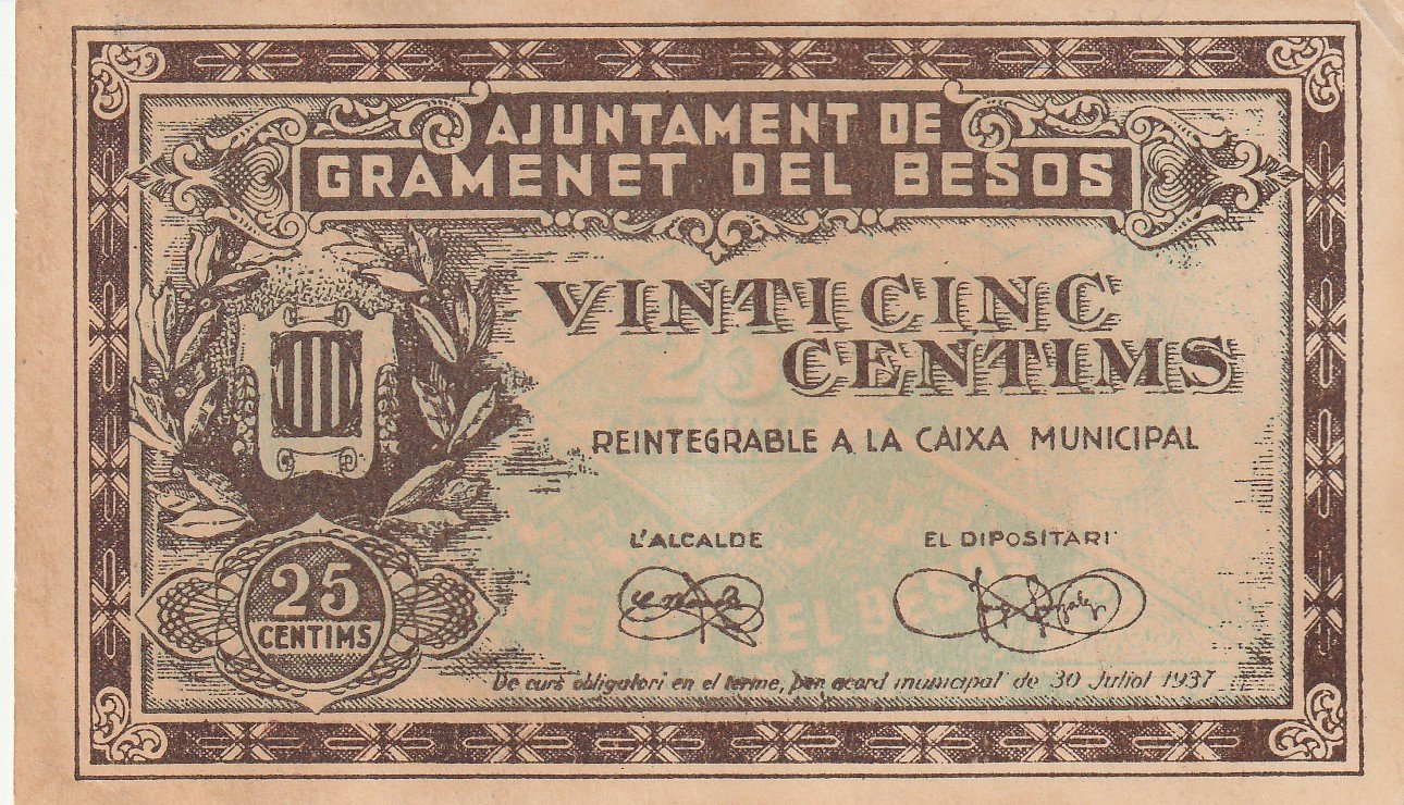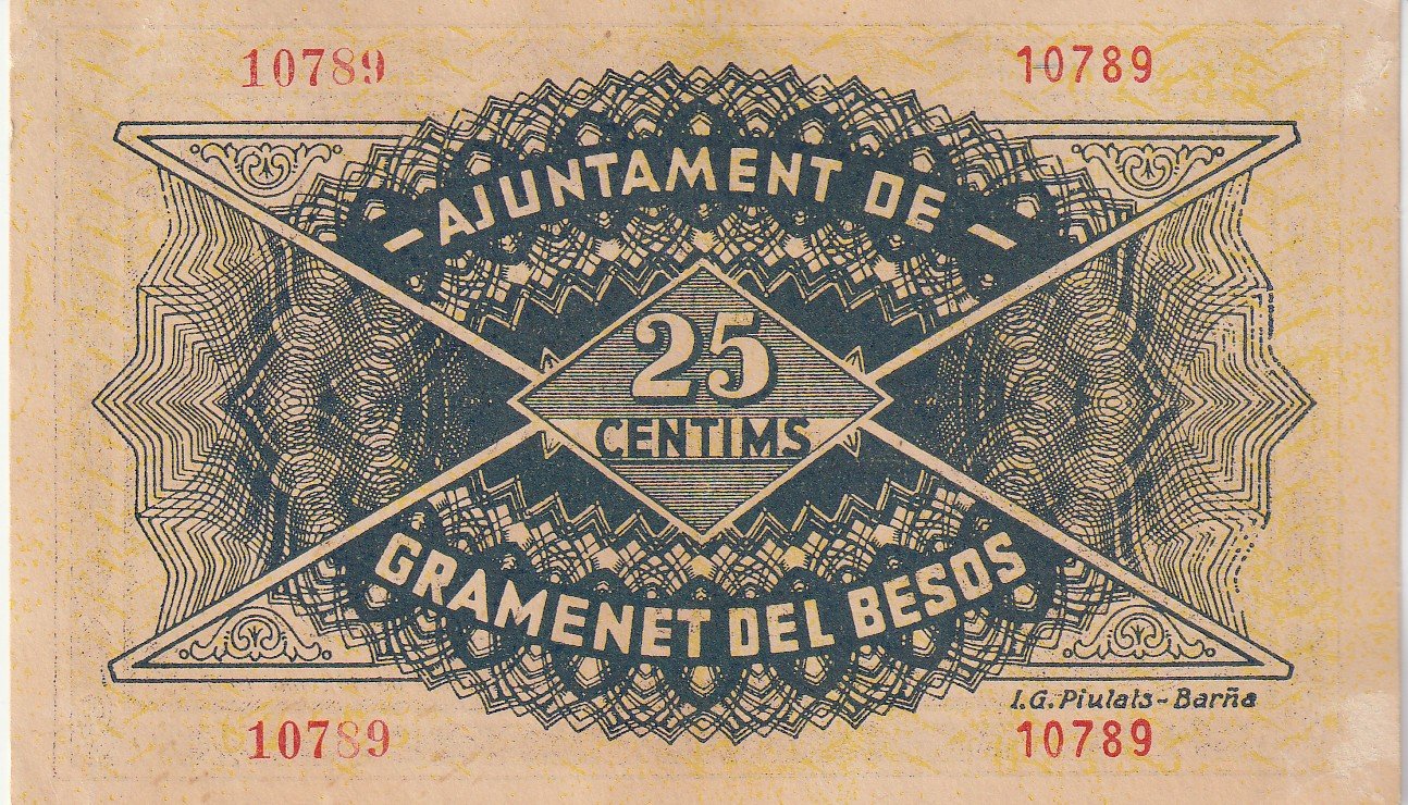 España, Billete Local de GRAMANET DEL BESOS, 25 Ctmos, 1937, Nº 10789, Look Scand, XF