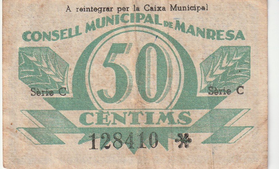 España, Billete Local de MANRESA, 50 Ctmos., 1937, Nº C-128410, Look Scand, Very Fine