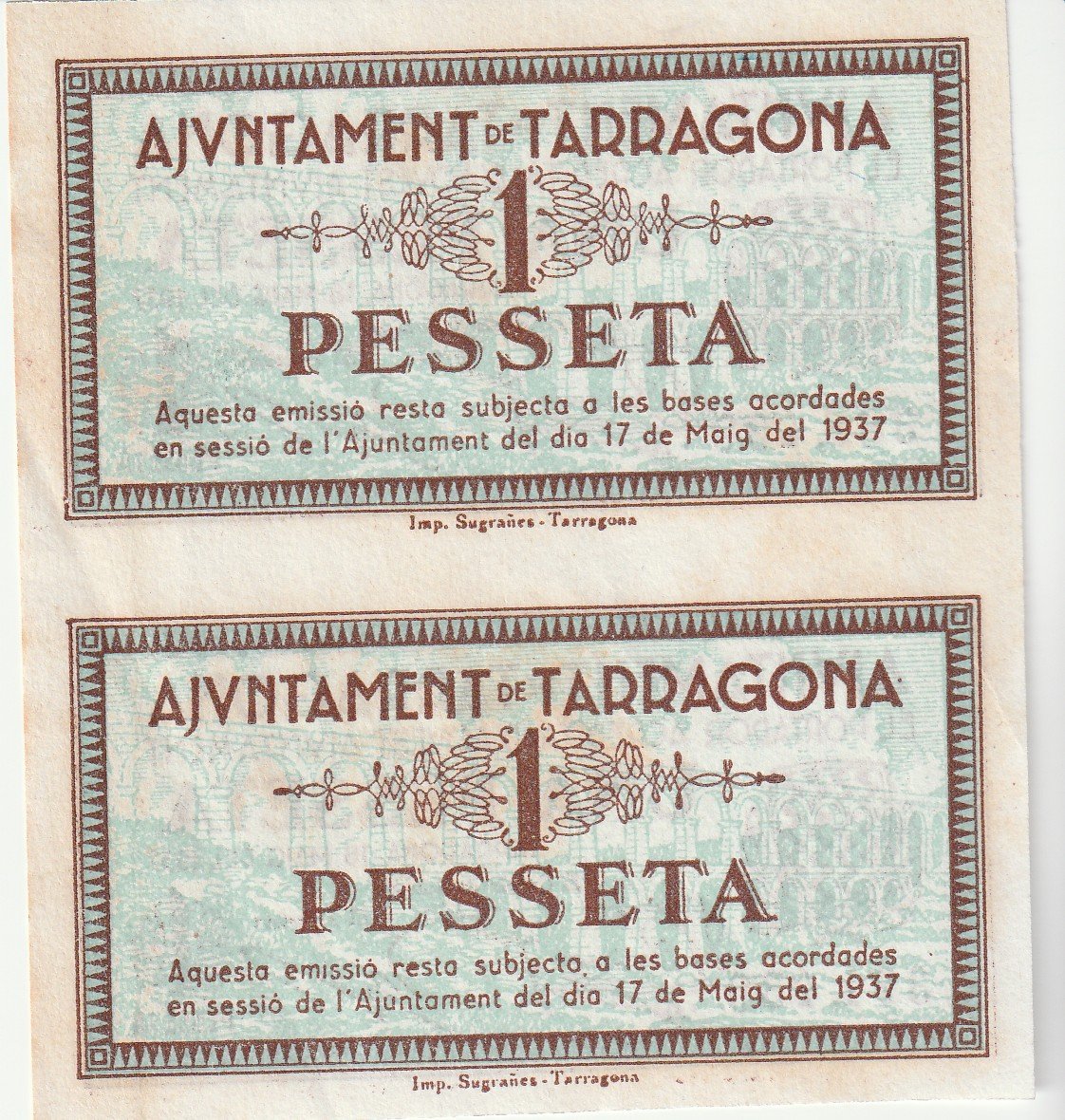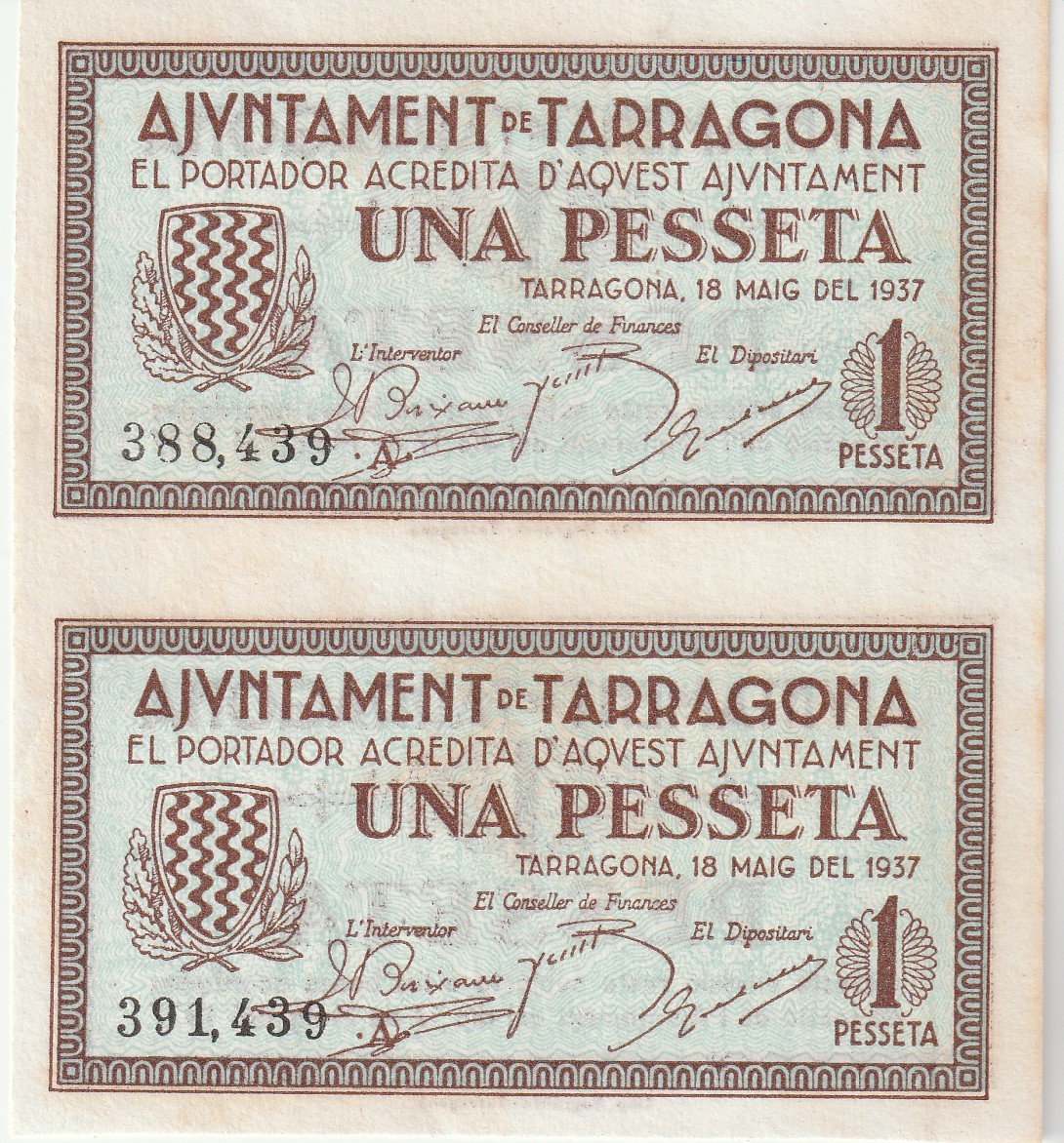 España, Billete Local de TARRAGONA, 1Pta. 1937, Pareja sin cortar, Nº 388439/391439, Look Scand, UNC