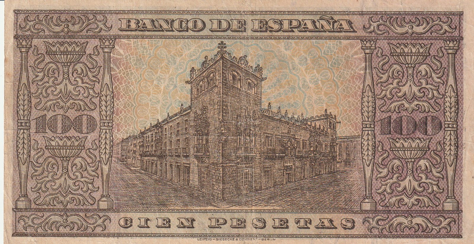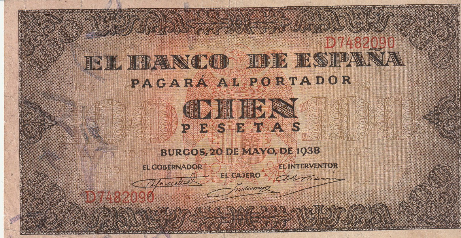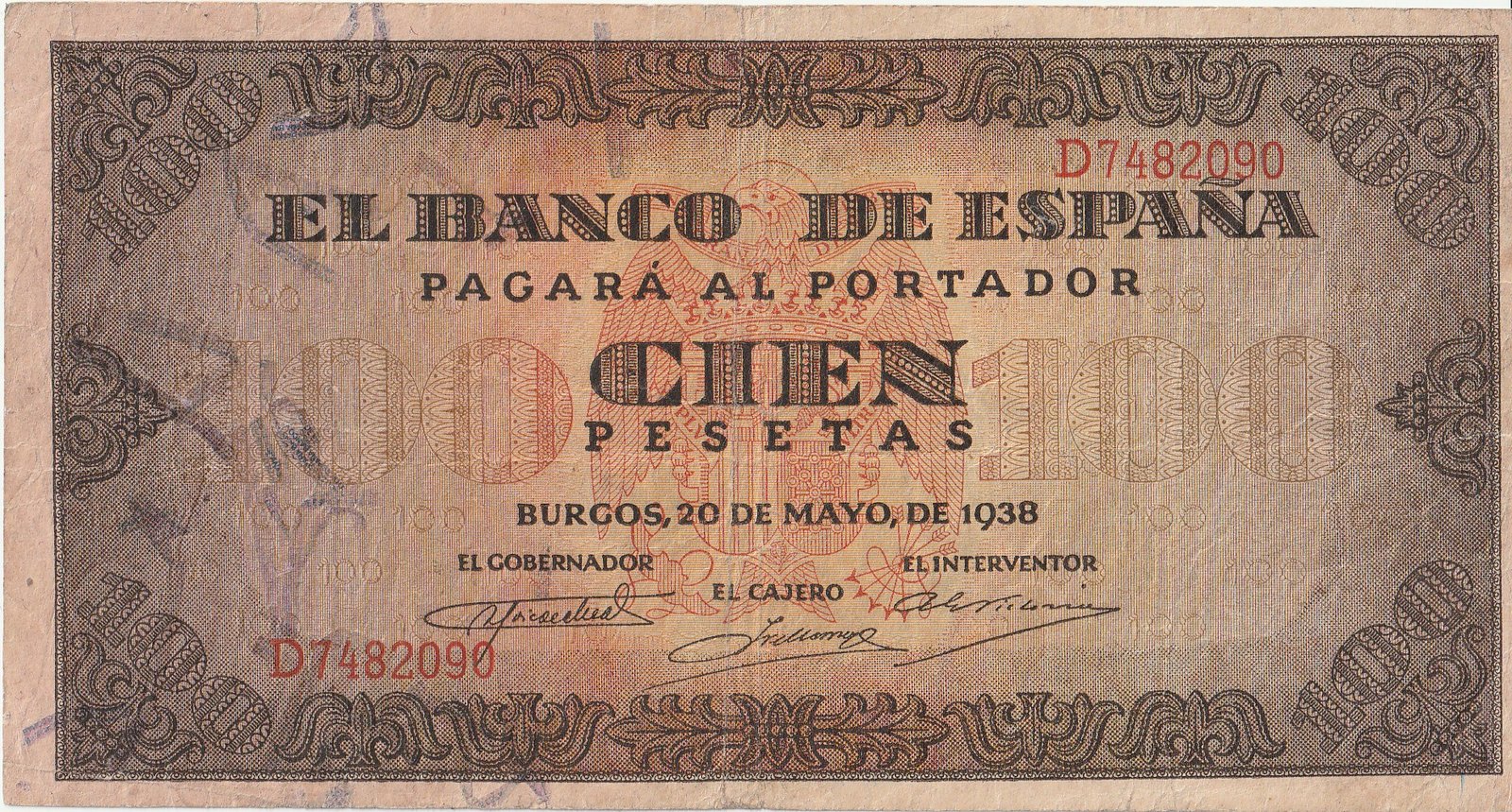 España ESP-P-113a(Guerra-485), 100 Ptas., Burgos, Nº D7482090, 20-Mayo-1938, Serie D, Look Scand, VF+