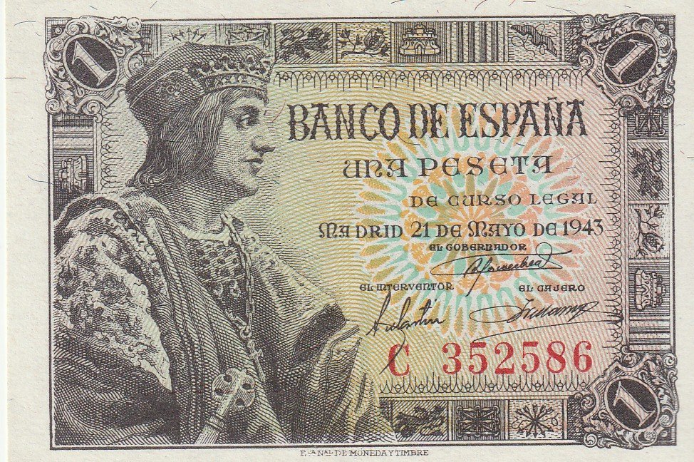 España ESP-P-126, 1 Pta., 1943, Serie «C», Nº C352586, Look Scand, UNC