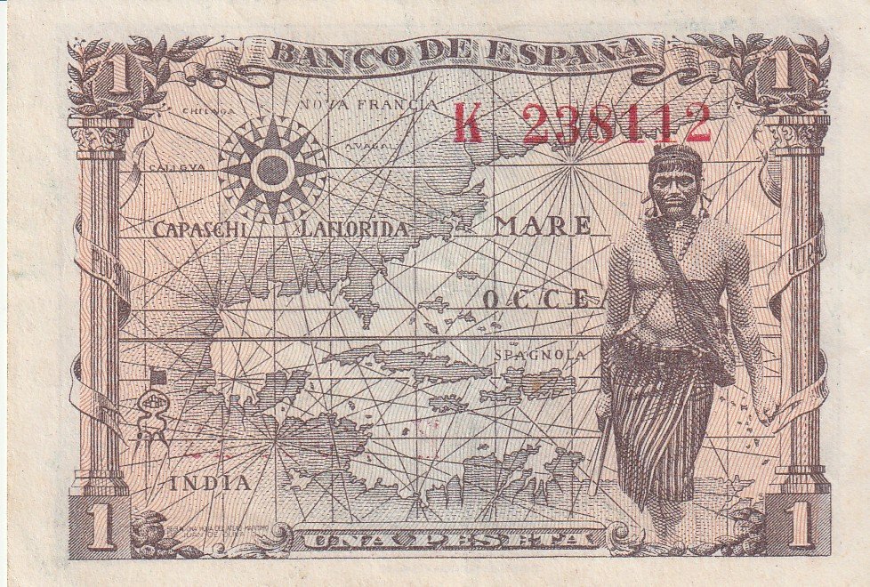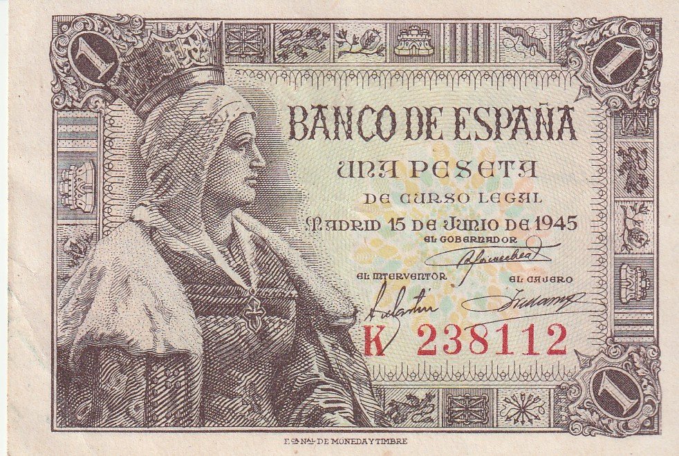 España ESP-P-128, 1 Pta., 1945, Serie «A», Nº K-238112, Look Scand, XF++