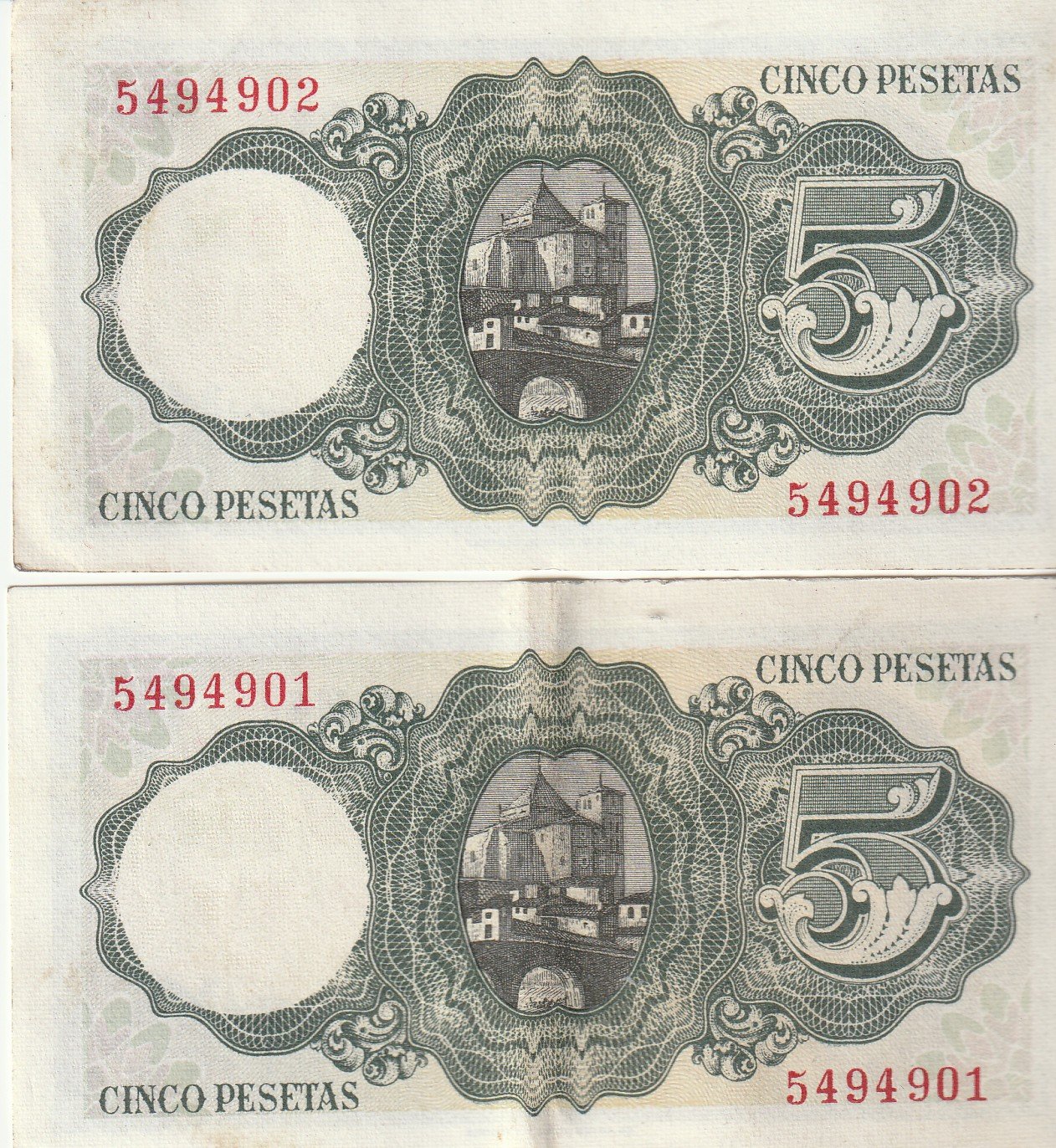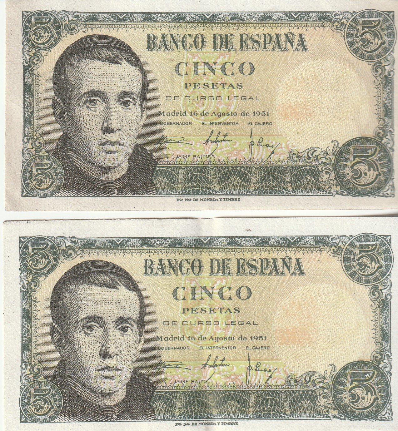 España ESP-P-140, 5 Ptas., 1951, Sin Serie, Pareja correlativa, Nº 5494901/2, Padre Balmes, Look Scand, XF