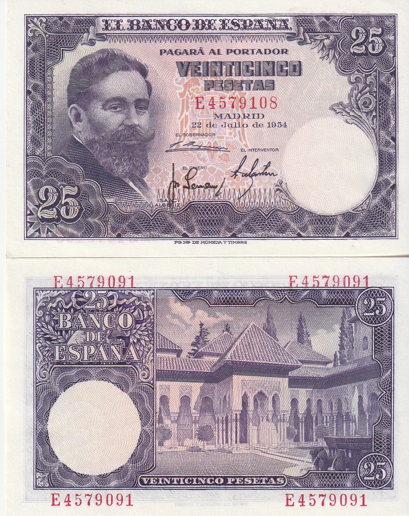 España ESP-P-147, 25 Ptas., 22-Julio-1954, Isaac Albeniz, Serie E, UNC