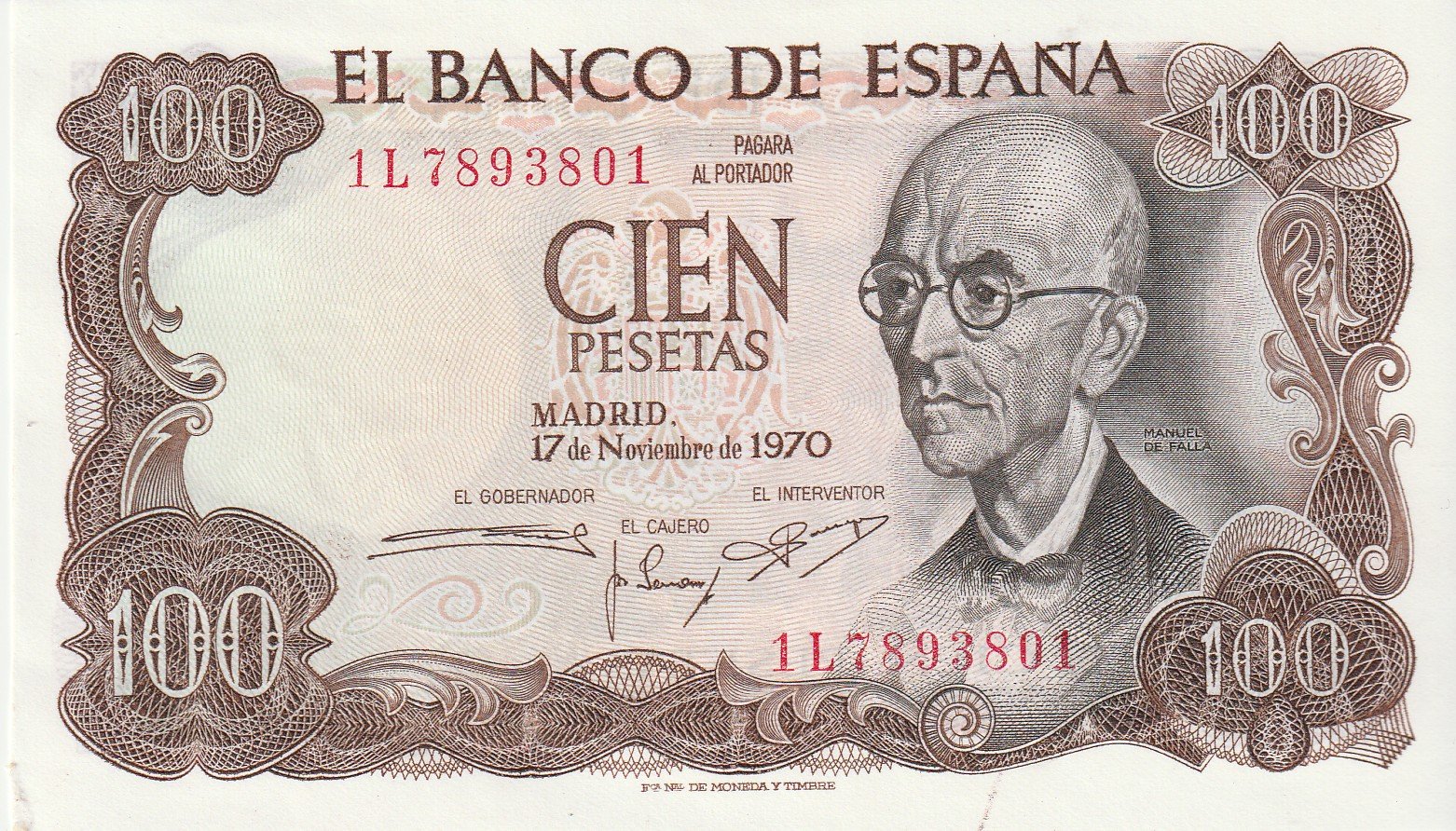 España ESP-P-152(1L), 100 Ptas., Manuel de Falla, Serie 1L, 17-11-1970, UNC