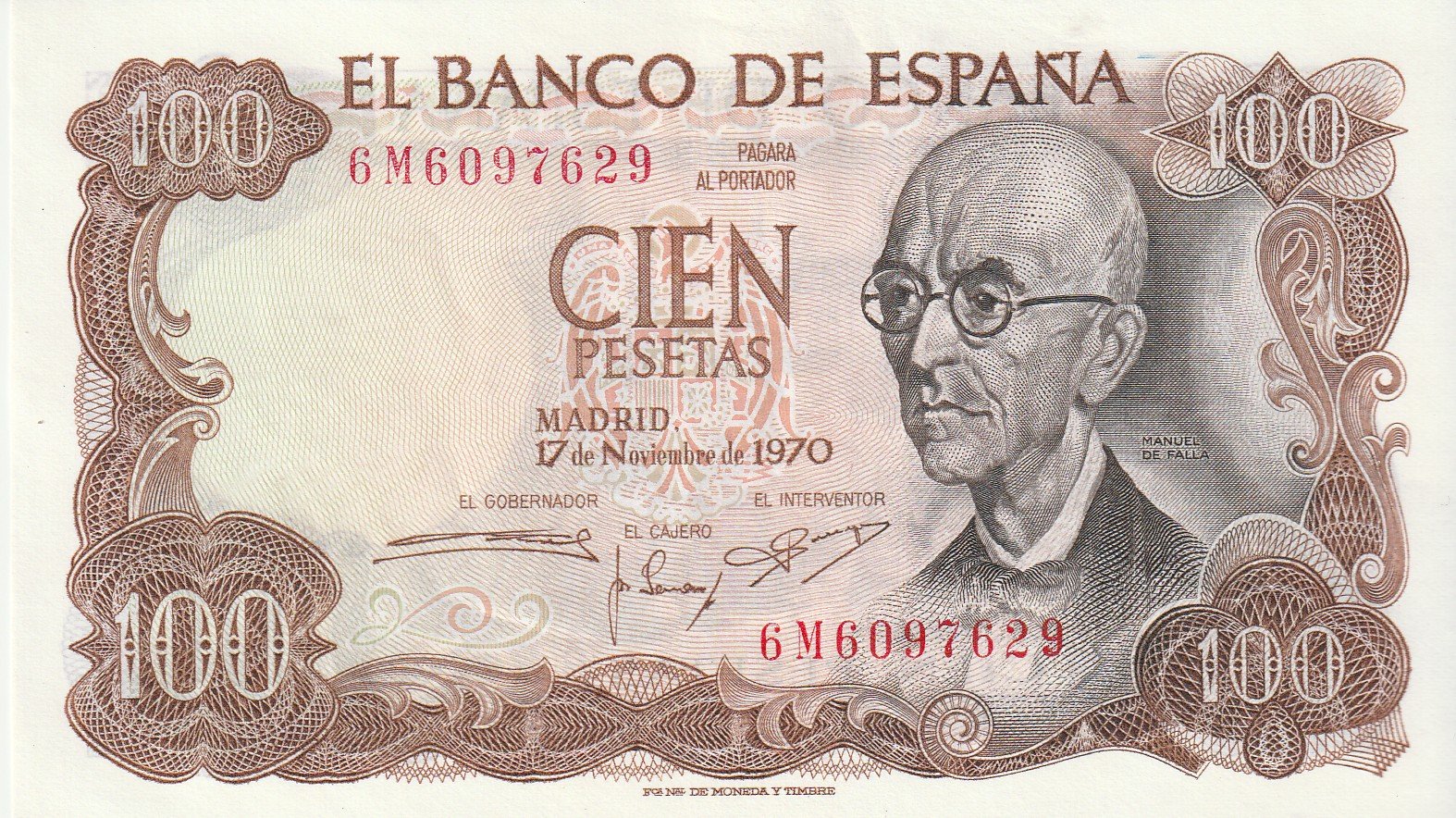 España ESP-P-152(6M), 100 Ptas., Manuel de Falla, Serie 6M, 17-11-1970, aUNC