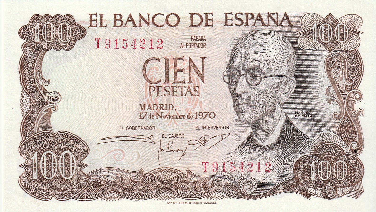 España ESP-P-152(T), 100 Ptas., Manuel de Falla, Serie T, 17-11-1970, UNC
