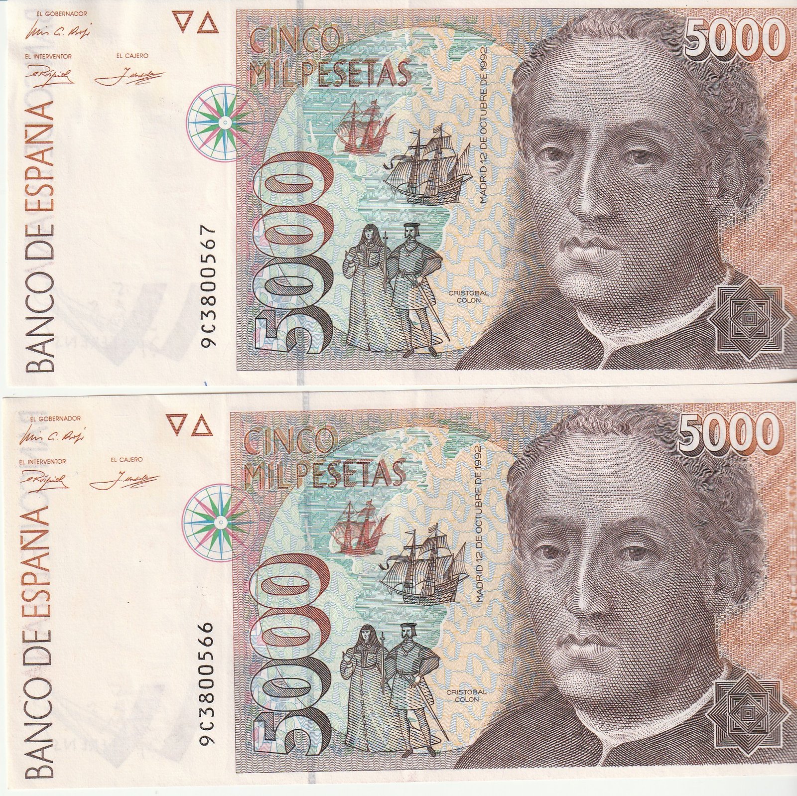 España ESP-P-165, 5.000 Ptas., 12-Octubre-1992, Serie 9C 3800566/567, Pareja Correlativa,Look Scand, XF