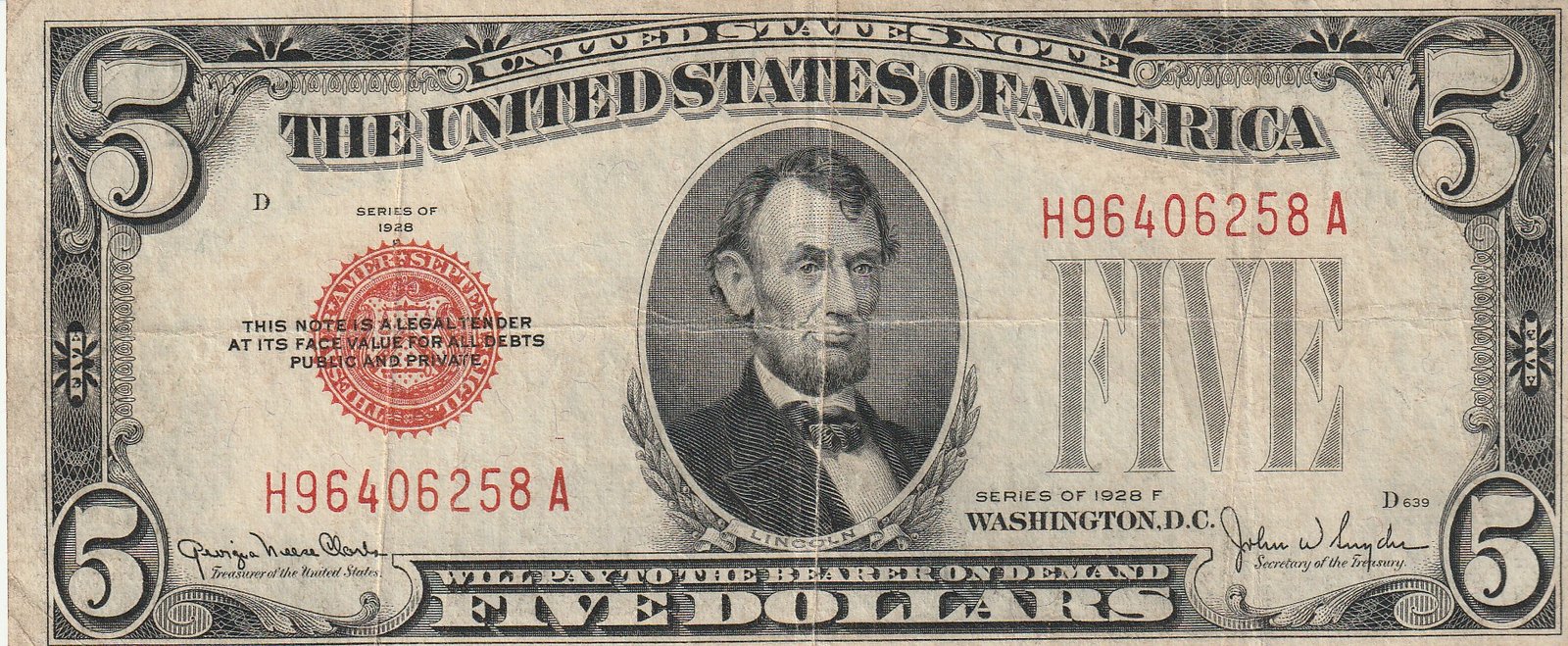 Estados Unidos USA-P-379f, 5$, Nº H9606258A, 1928F, Look Scand, Very Fine