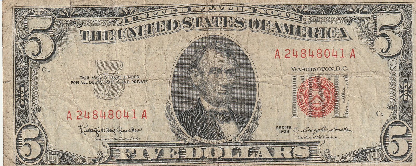 Estados Unidos USA-P-383, 5$, Nº A248480041A, 1963, Look Scand, Very FIne