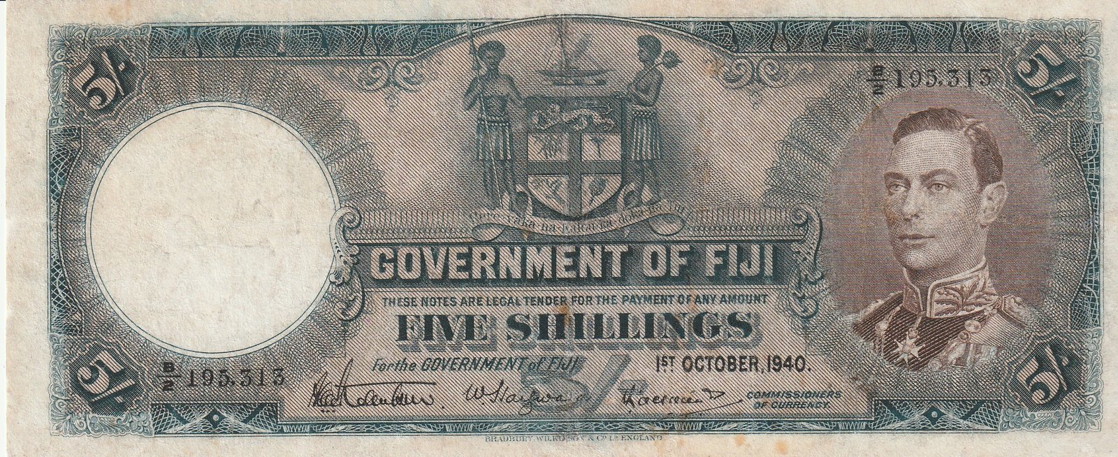 Fiji FIJ-P-37c, 5 Schillings, 1-10-1940, Nº.-B/2-195313, Look Scand, VF+