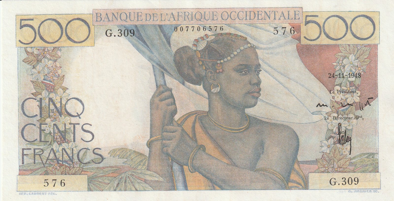 French West Africa-P-41(2), 500 Fcos., 24-Noviembre-1948, Nº.-007706576, Look Scand, XF