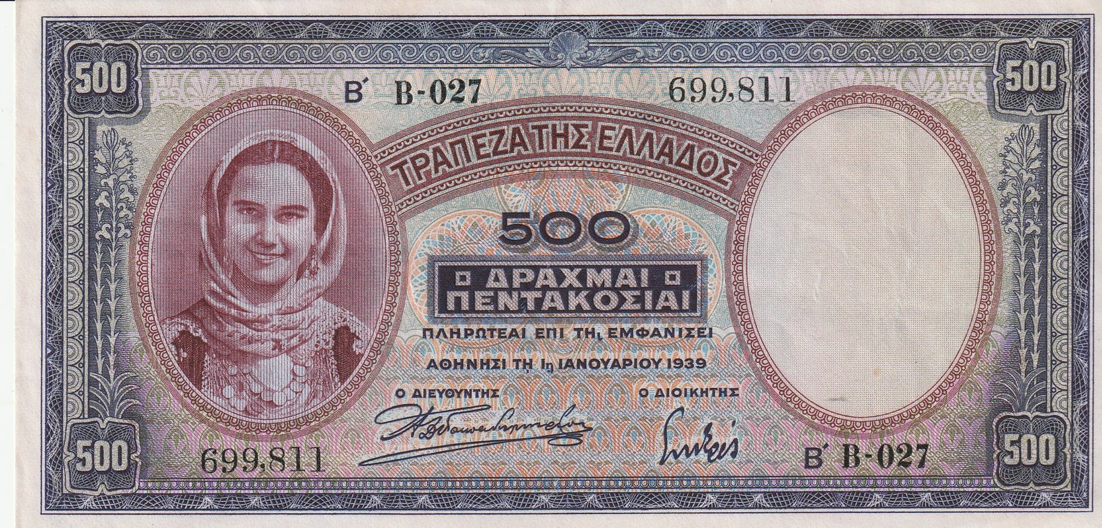 Grecia GRE-P-109, 500 Drachmai, 1939, Look Scand, XF