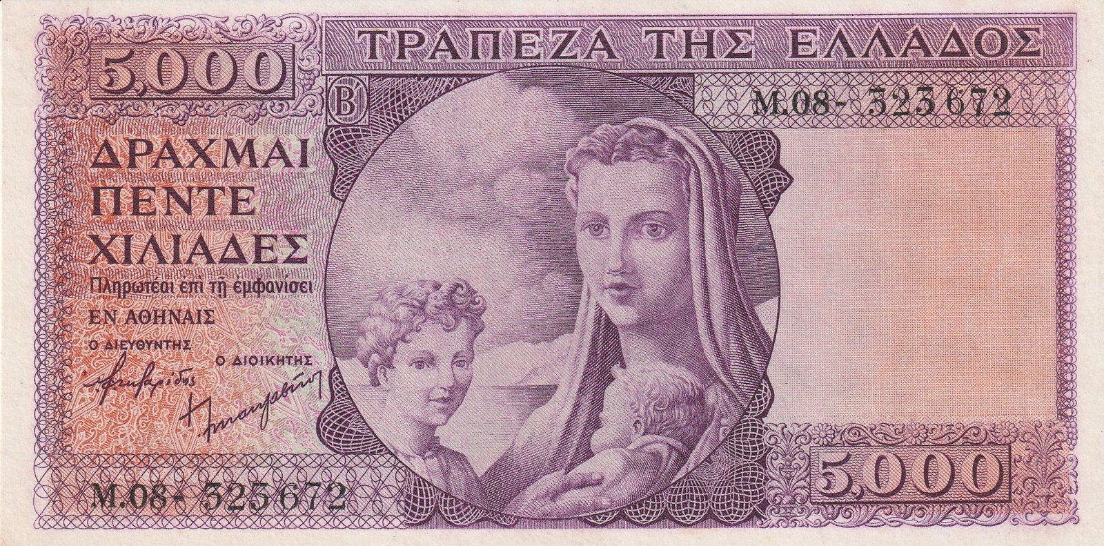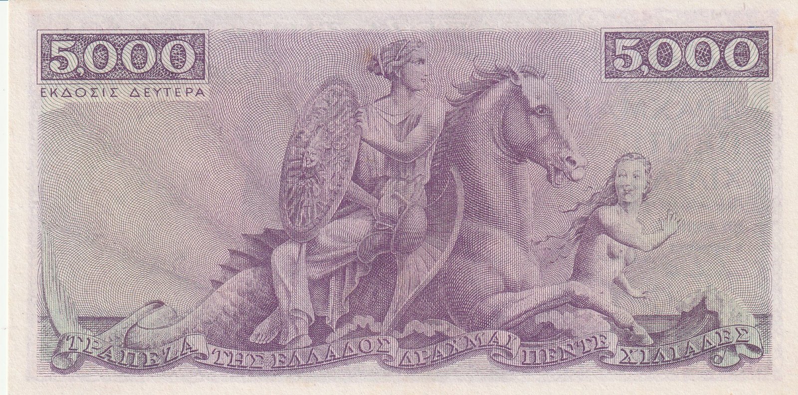 Grecia GRE-P-177a, 5.000 Drachmai, ND-1947, Nº 325672, XF+