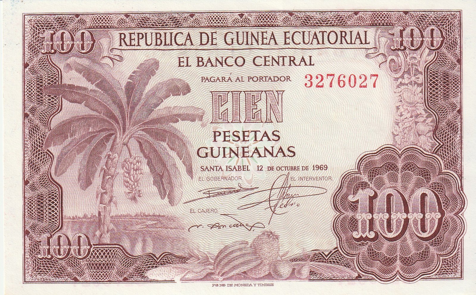 Guinea Ecuatorial EQG-P-1, 100 Ptas. Guineanas, 12-10-1969, UNC