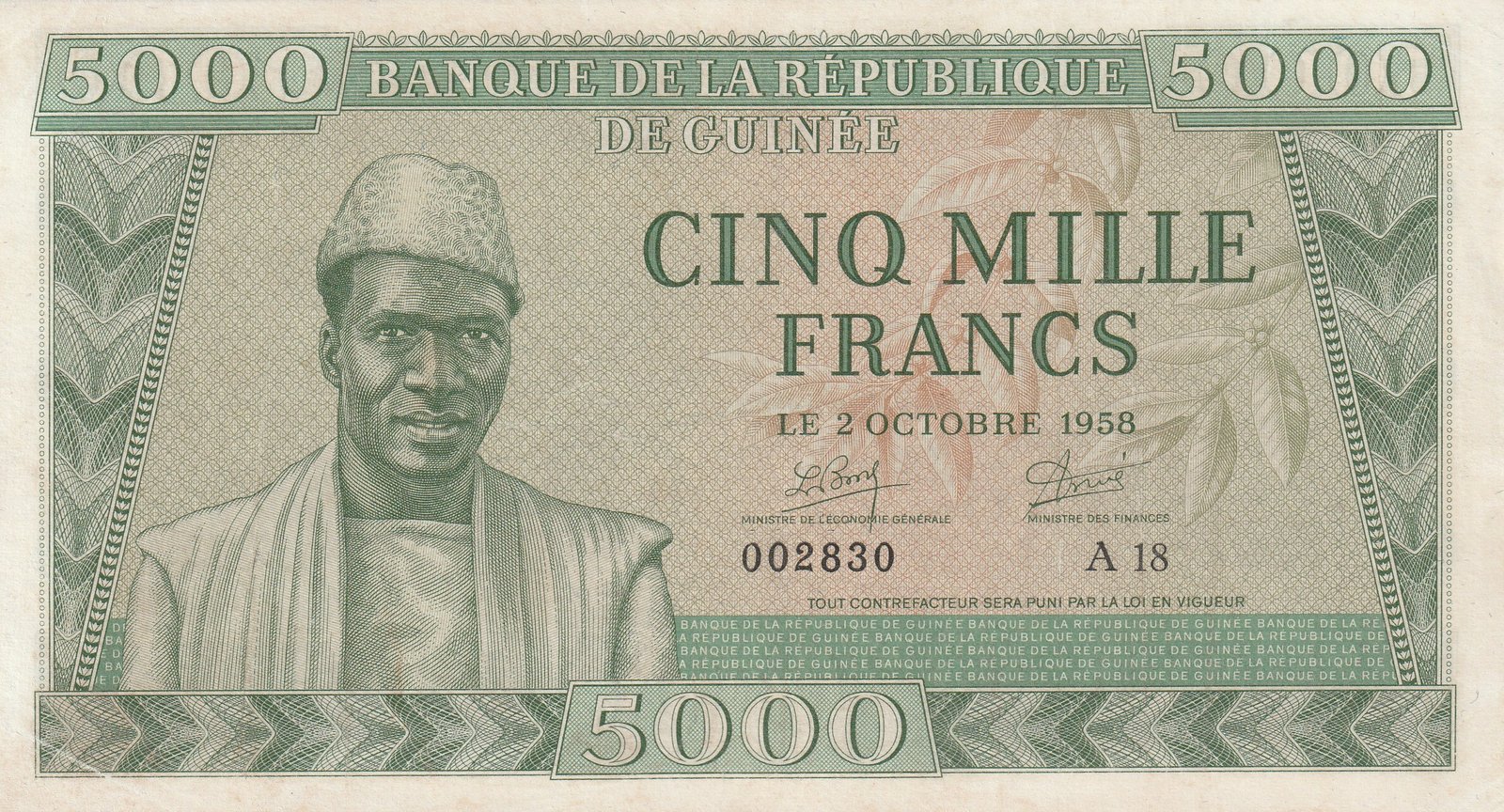 Guinea GUI-P-10, 5.000 Fcos., 1958, Nº 002830, Look Scand, Very Fine++