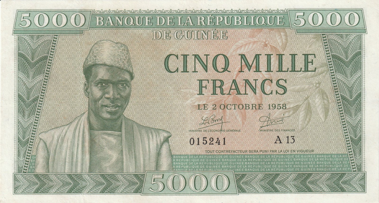 Guinea GUI-P-10, 5.000 Fcos., 1958, Nº 015241, Look Scand, Very Fine