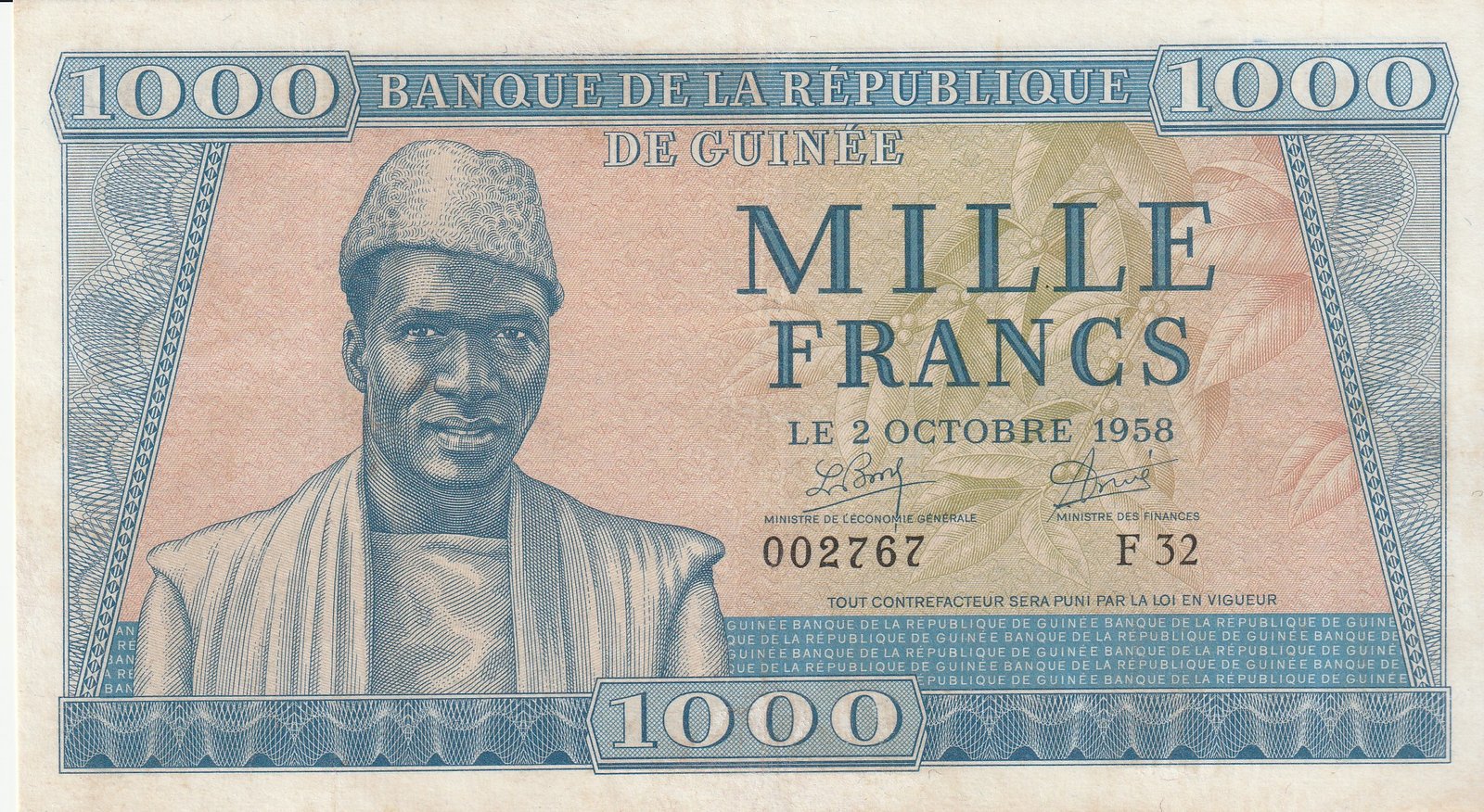 Guinea GUI-P-9, 1.000 Fcos., Nº.- 002767, 2-10-1958, Look Scand, Very Fine-