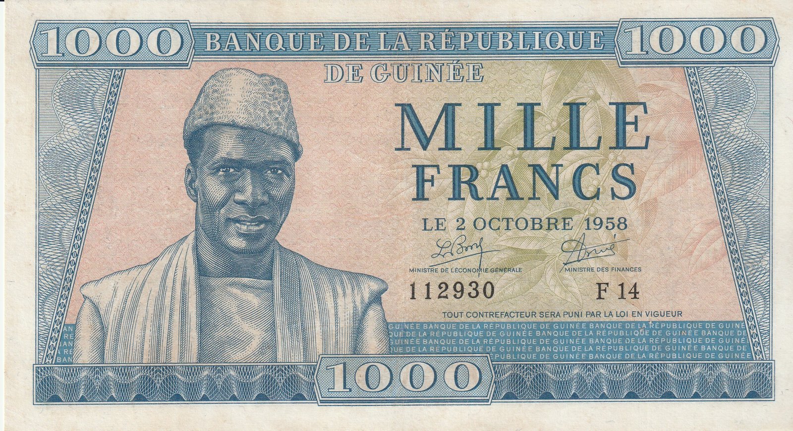 Guinea GUI-P-9, 1.000 Fcos., Nº.- 068000, 2-10-1958, Look Scand, XF+