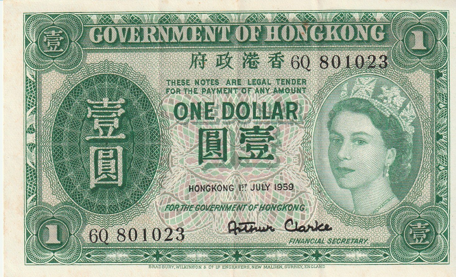 Hong Kong HKG-P-324Ab, 1 $, 1-7-1959, Nº.- 6Q-801023, Look Scand, XF/Steins