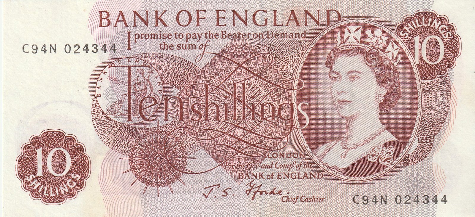 Inglaterra GBT-P-373c, 10 Shillings, ND-1970, Nº C94N-024344, look Scand, aUNC