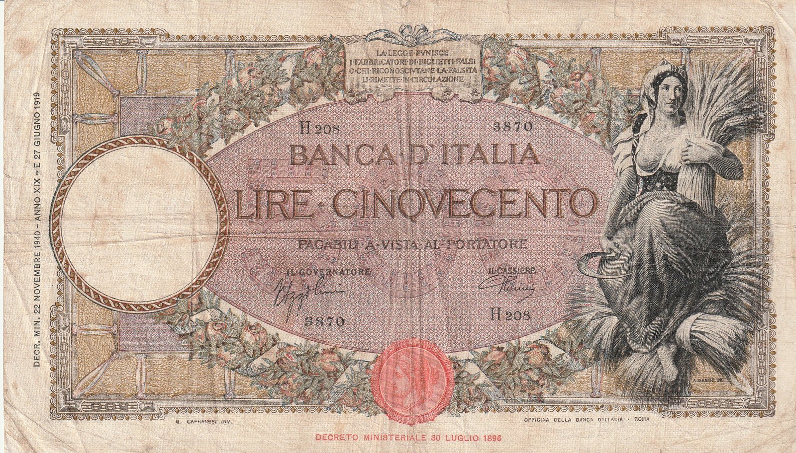 Italia ITA-P-51d, 500 Lire, 22-Noviembre-1940, Nº H208/3870, Look Scand, Very Fine