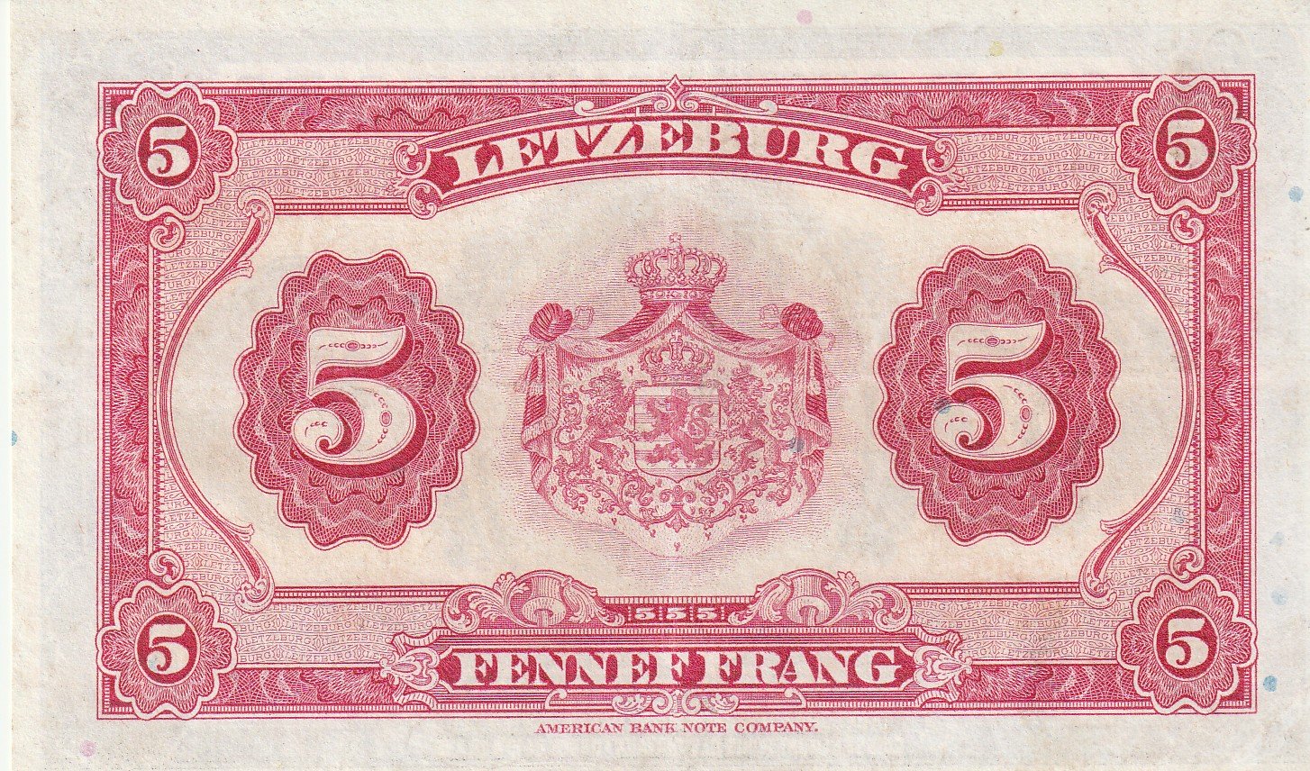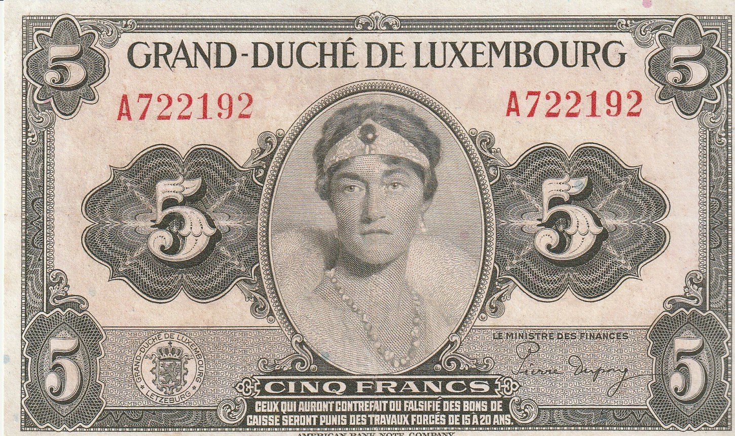Luxemburgo LUX-P43b, 5 Francos, ND-1944, Look Scand, Nº.-A722192, XF+