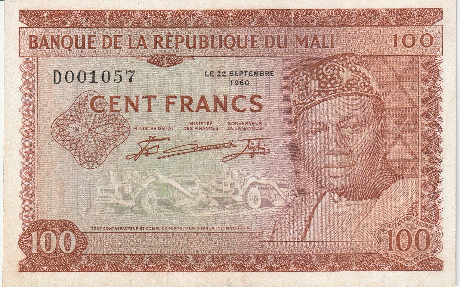 Malí MLI-P-7, 100 Fcos., Nº.- D001057, 22-Sept.-1960, Look Scand, XF+