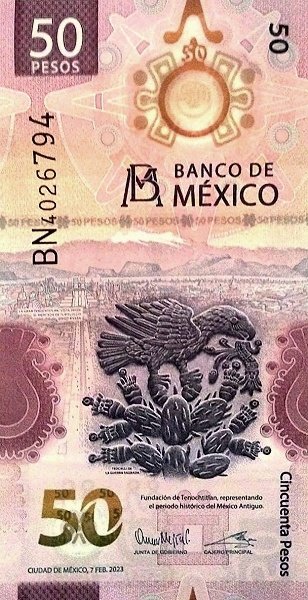 México MEX-P-W133(2-2023-2), 50 Pesos, 7-Febrero-2023, Polímero, Sig.: Omar Mejia Castelazo & Alejandro Alegre Rabiela, Bicentenario Independencia Nacional, UNC