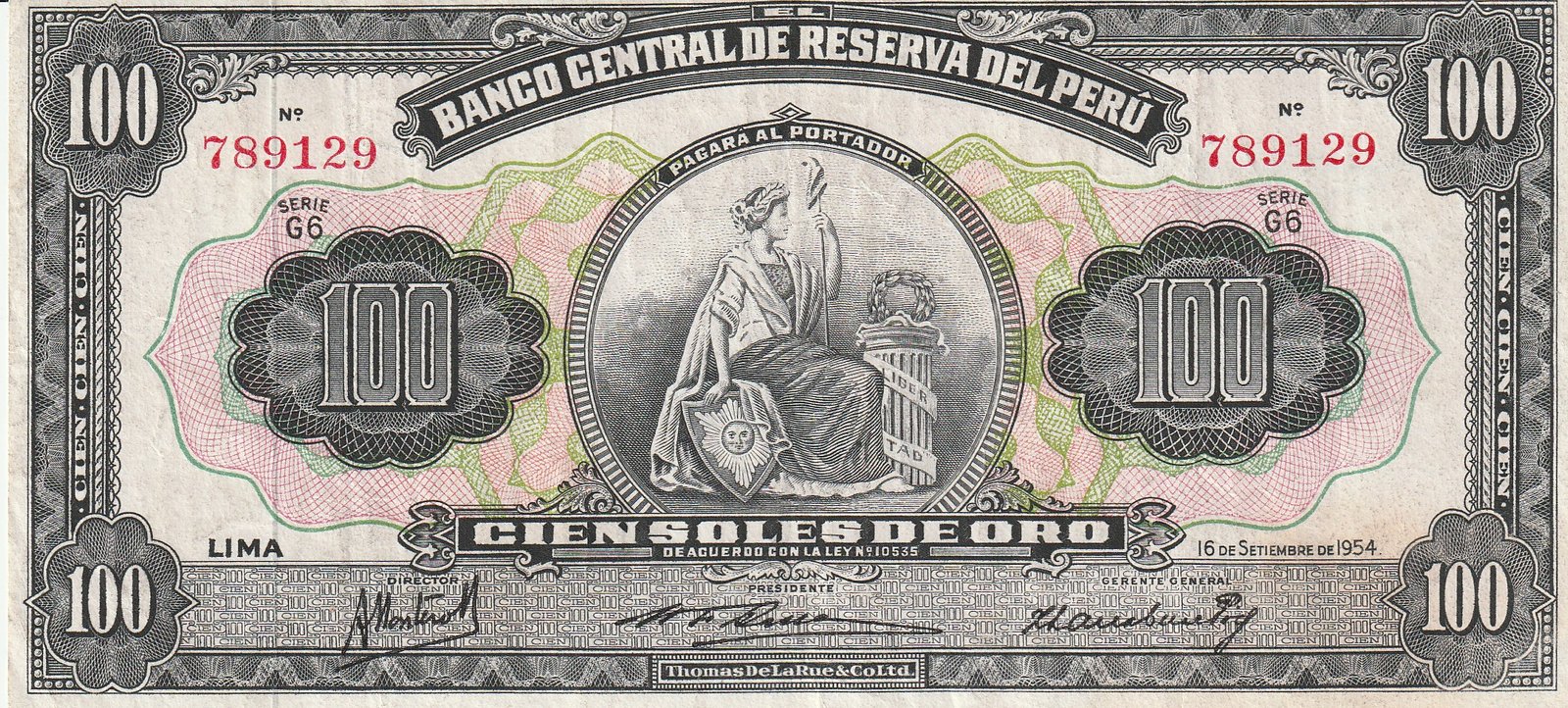 Perú PER-P-73(54), 100 Soles, 1954, Nº 789129, Look Scand, XF-/Grafitis Rev