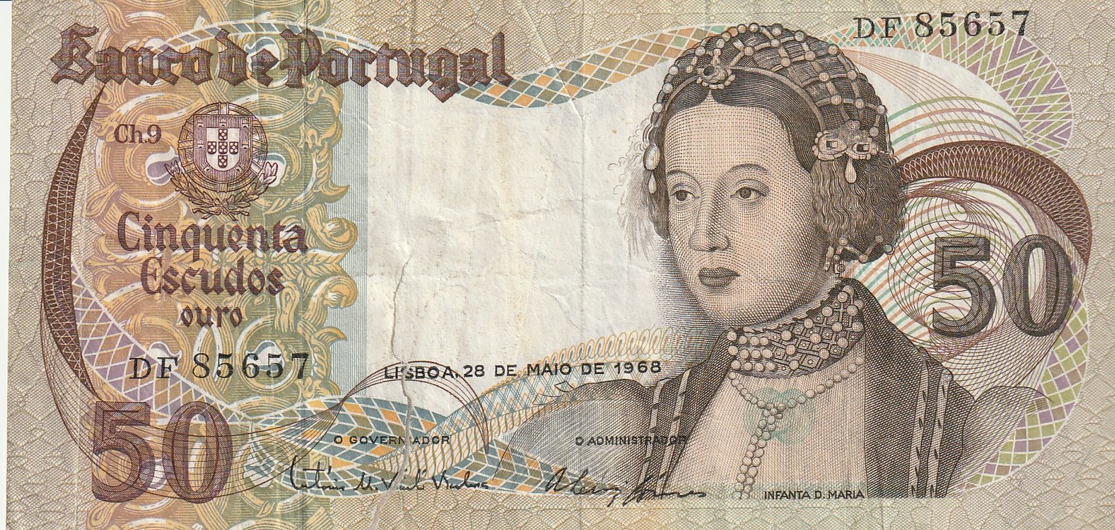 Portugal PTG-P-174a(5), 50 Escudos, 1968, Nº DF85657, Look Scand, VF+