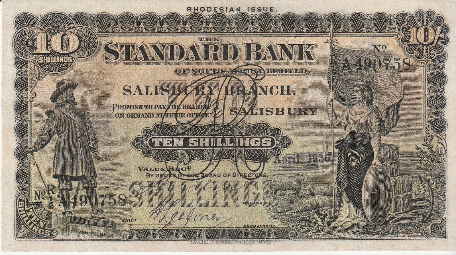 Rhodesia RHO-P-S146b, 10 Schillings, 4-Abril-1936, Look Scand, Very Fine++