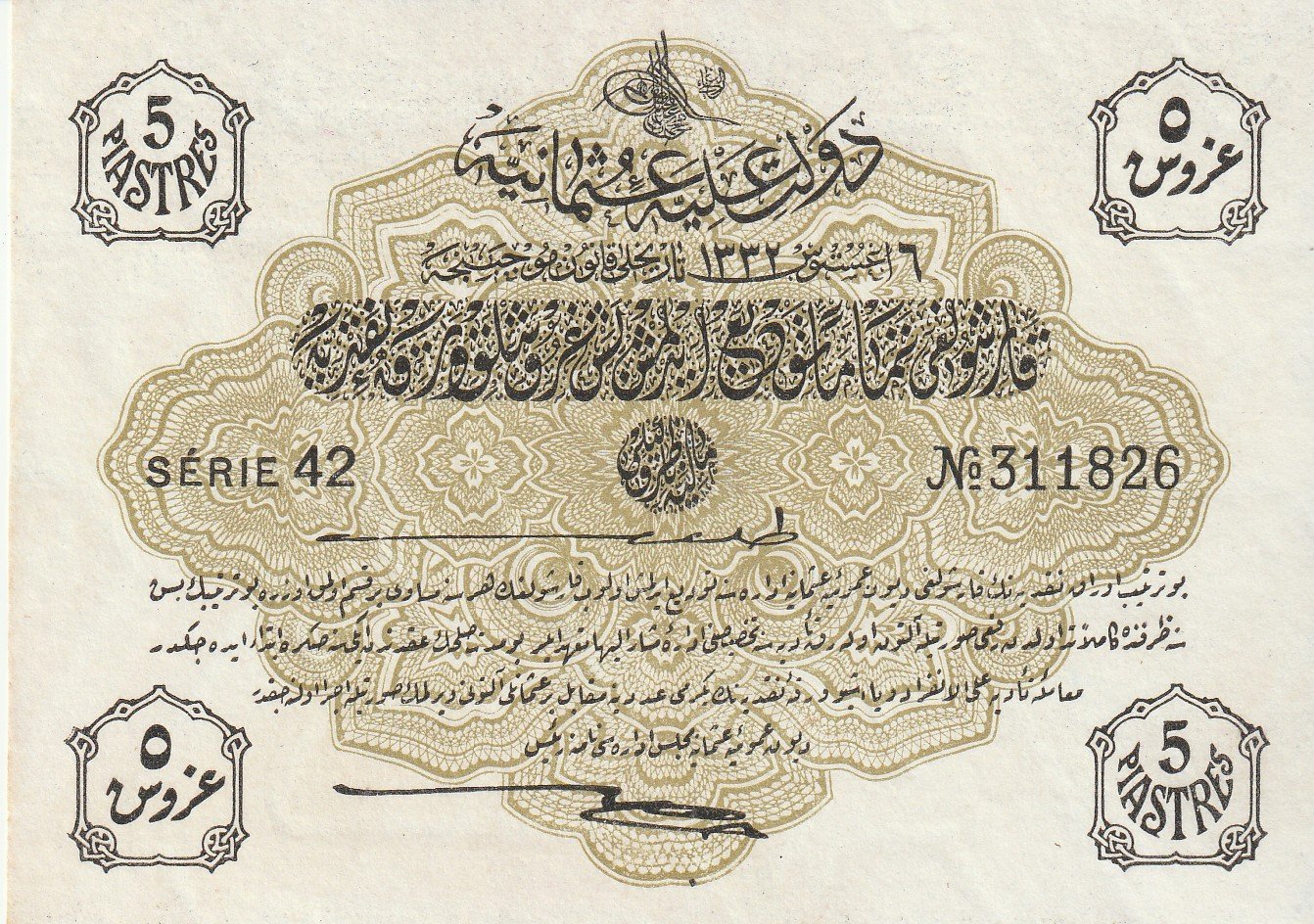 Turquia TUQ-P-87, 5 Piastres, Nº 311826, 1916, Uniface, Look Scand, XF